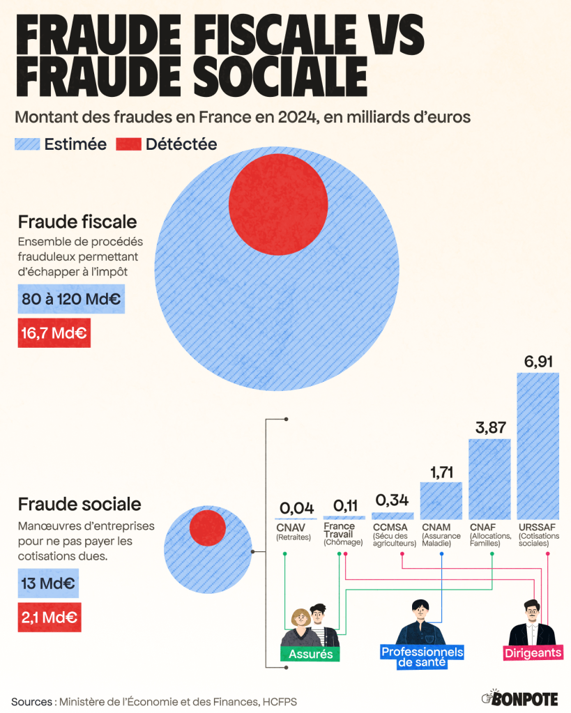Alors oui il y a des fraudeurs, mais peut-être pas ceux désignés par Bruno le Maire ! En effet en 2024, la fraude sociale est estimée à 13 milliards d’€, alors que la fraude fiscale, à 120 milliards d’€ !