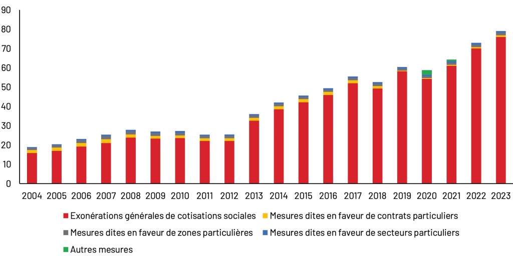 80 milliards d’ € annuels d’exonérations de cotisations sur les bas salaires (double des dépenses d’allocations chômage) sans contreparties instauré suite à l’abandon du CICE (gabégie d’argent public à 200 000 € par emploi créé soit 4 fois le coût annuel moyen d’un emploi) suite au constat de son échec en terme de croissance et d’emploi ! Un dispositif qui a répondu dans les années 90 à un besoin de création d’emplois pour une main d’œuvre peu qualifié face à un chômage important, mais qui a aujourd’hui de nombreux effets négatifs, et dont l’efficacité en terme de création d’emploi aujourd’hui sont plus que discutés.