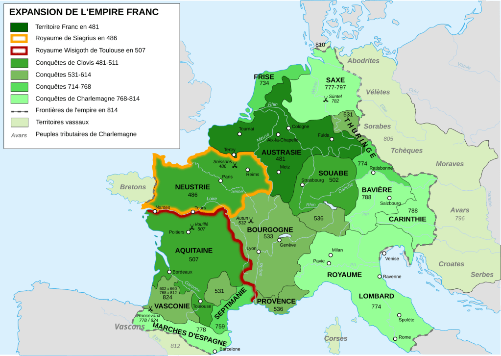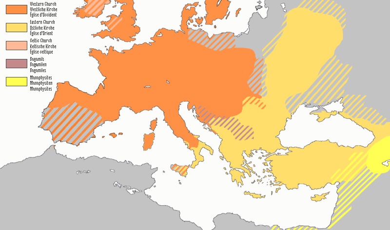 Par exemple, le schisme de 1054, entérine la séparation territoriale et linguistique entre l’Église de Rome d’Occident et l’Église de Constantinople d’Orient. Il est question alors de pacifier les relations entre de Pape de Rome qui veut imposer le rite latin (catholique) et le patriarche de Constantinople qui impose la pratique du rite grec (orthodoxe). Pourtant ce schisme correspond peu ou proue aux Empires Carolingien et Byzantin qui se partagent tout l’Ouest de l’Eurasie à l’époque, et à la séparation des empires Romain d’Orient et Romain d’Occident depuis 365 :
